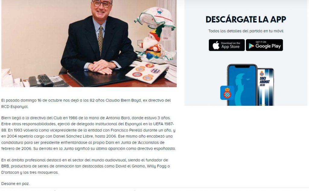 El ex vicepresidente del RCD Espanyol Claudio Biern Boyd, que también fue en 2006 candidato a la presidencia, murió hace unos días y la web oficial del club blanquiazul le dedicó un breve obituario, de menos de ciento cincuenta palabras (ciento cincuenta y dos si se incluye el titular).