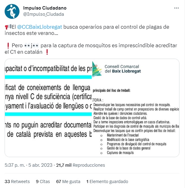 Este miércoles os traemos un nuevo ejemplo de lo ridículos que pueden llegar a ser los separatistas más radicales. El Consell Comarcal del Baix Llobregat ha ofertado un puesto de trabajo para controlar plagas de insectos. Y ‘sorpresa’, es imprescindible acreditar un buen nivel de catalán para poder acceder al puesto de trabajo.