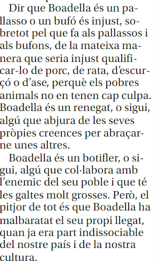 «Boadella es un traidor, o sea alguien que colabora con el enemigo de su pueblo y que tiene la cara muy dura. Pero lo peor de todo es que Boadella ha estropeado su propio legado, cuando ya era parte indisociable de nuestro país y de nuestra cultura».