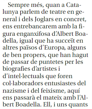 Y va más allá al afirmar que «cuando en Cataluña hablemos de teatro en general, y de Els Joglars en concreto, nos tropezaremos con la figura pegajosa de Albert Boadella».