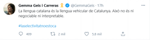 Como era de esperar la consellera de Universidades, Gemma Geis, ha dejado claro que no piensan cumplir dicha sentencia afirmando que «la lengua catalana es la lengua vehicular de Cataluña» y ha advertido que «las pruebas de acceso a la universidad no se tocan«.