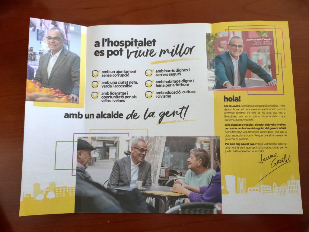 Esquerra Republicana ha inundado los buzones de L’Hospitalet de Llobregat, la segunda ciudad de catalana, con un tríptico propagandístico con información de su candidato, Jaume Graells i Veguin, para las próximas elecciones municipales que se celebrarán el próximo 28 de mayo.