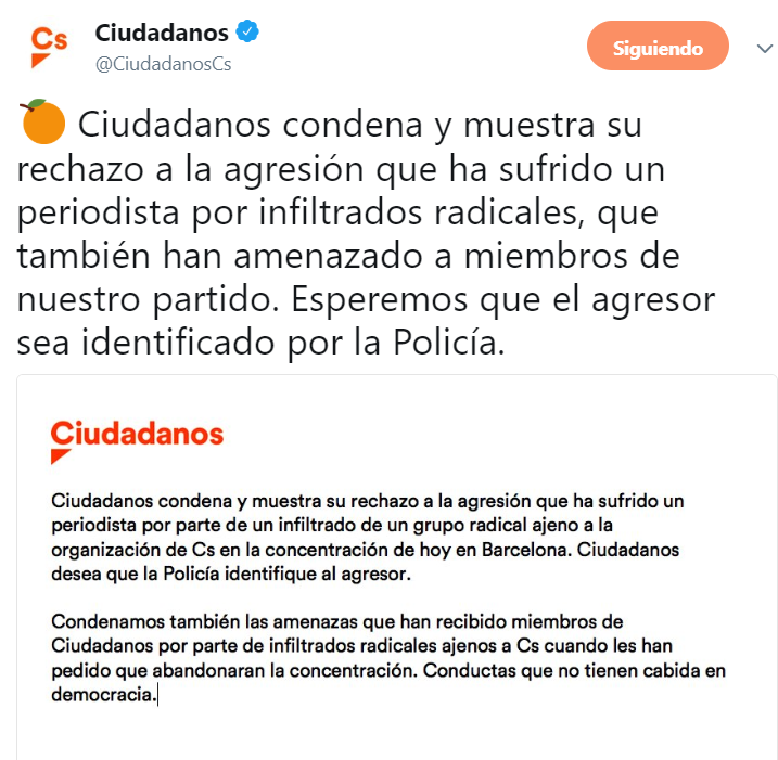Durante la concentración un par de vándalos ajenos a la organización golpearon a un periodista de Telemadrid y amenazaron a miembros de Cs y de España Ciudadana. Ciudadanos ha condenado estos hechos.