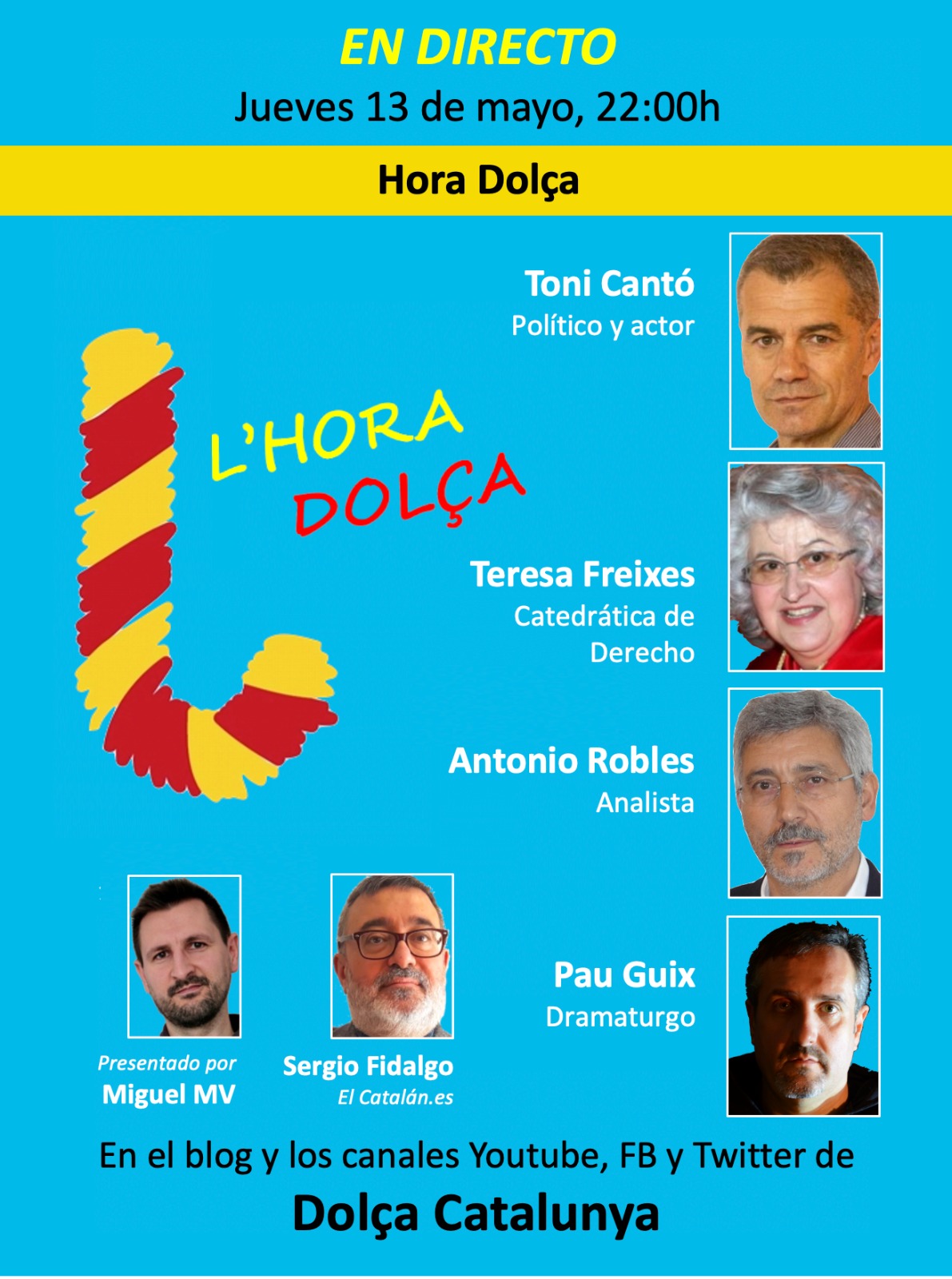 Pero nos da igual: Cantó es un dolço esté donde esté. Y este jueves a las 22:00, el día de la Virgen de Fátima, estará en la Hora Dolça en directo, charlando de la actualidad con la catedrática Teresa Freixes, el analista Antonio Robles, el dramaturgo Pau Guix, el director de Elcatalan.es Sergio Fidalgo, y el inigualable Miguel MV.
