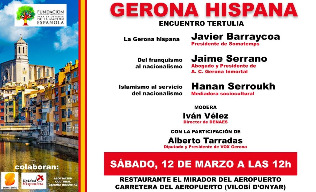 La Fundación para la Defensa de la Nación Española (DENAES) organizará, junto a Somatemps y Asociación Cultural Gerona Inmortal un acto dedicado a la «Gerona Hispana». Será el sábado 12 de marzo a las 12:00 en el restaurante El mirador del aeropuerto (carretera de aeropuerto, en Vilobí d’Onyar).