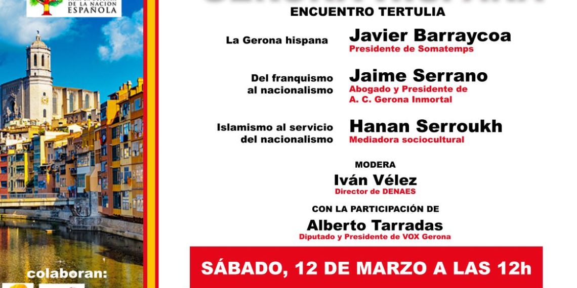 Consistirá en un encuentro tertulia con varias ponencias. Javier Barraycoa hablará sobre la «Gerona hispana», Jaime Serrano dedicará su exposición a «Del franquismo al nacionalismo» y Hanan Serroukh lo hará sobre «El islamismo al servicio del nacionalismo». El moderador será Iván Vélez, director de DENAES. También participará Alberto Tarradas, diputado en el Parlament y diputado de VOX Gerona.