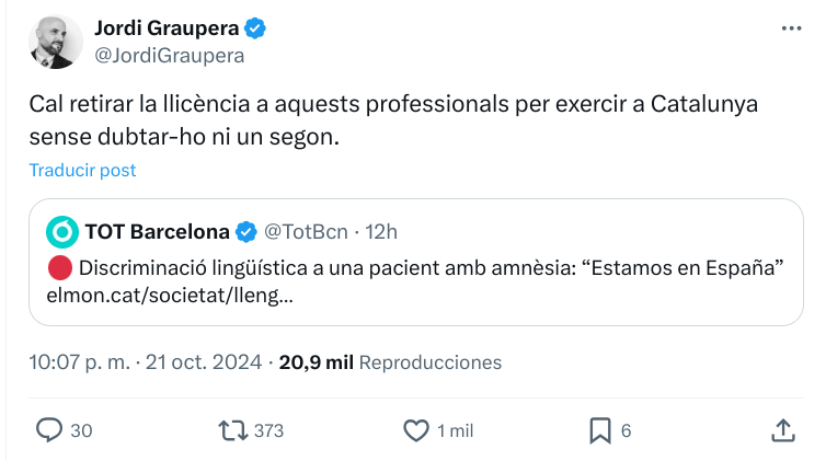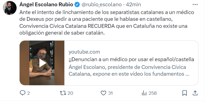 Algunos radicales están exigiendo, a través de sus redes sociales, que le sea retirada la licencia a este doctor y que con ello no pueda ejercer su trabajo en Cataluña. El presidente de Convivencia Cívica Catalana, Ángel Escolano, ha asegurado al respecto que “cualquier trabajador o profesional puede alegar válidamente el desconocimiento del catalán (STC 31/2010), que solo se puede exigir en situaciones especiales de dependencia (educación o función pública)”.
