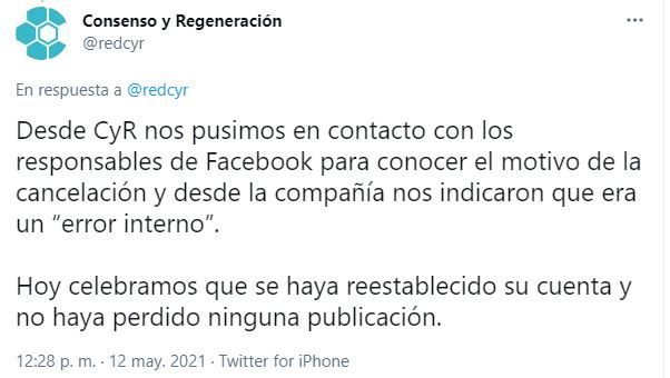 La plataforma cívica Consenso y Regeneración, que coordina Joaquín Villanueva, ha relatado en sus redes sociales que «nos pusimos en contacto con los responsables de Facebook para conocer el motivo de la cancelación y desde la compañía nos indicaron que era un ‘error interno’. Hoy celebramos que se haya reestablecido su cuenta y no haya perdido ninguna publicación».