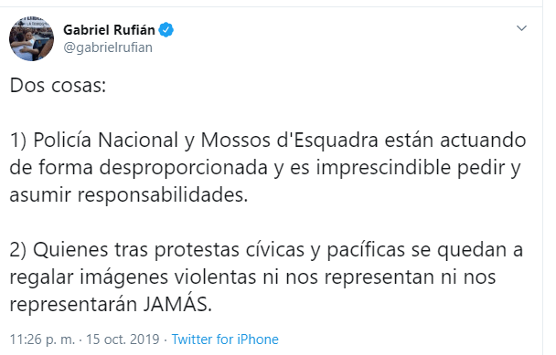 Así lo ha expresado en Twitter el portavoz de Esquerra en el Congreso, Gabriel Rufián, que ha afirmado de forma tajante que tanto la Policía Nacional como los Mossos están actuando de forma «desproporcionada«, y afirma que habrá que asumir responsabilidades por ello.