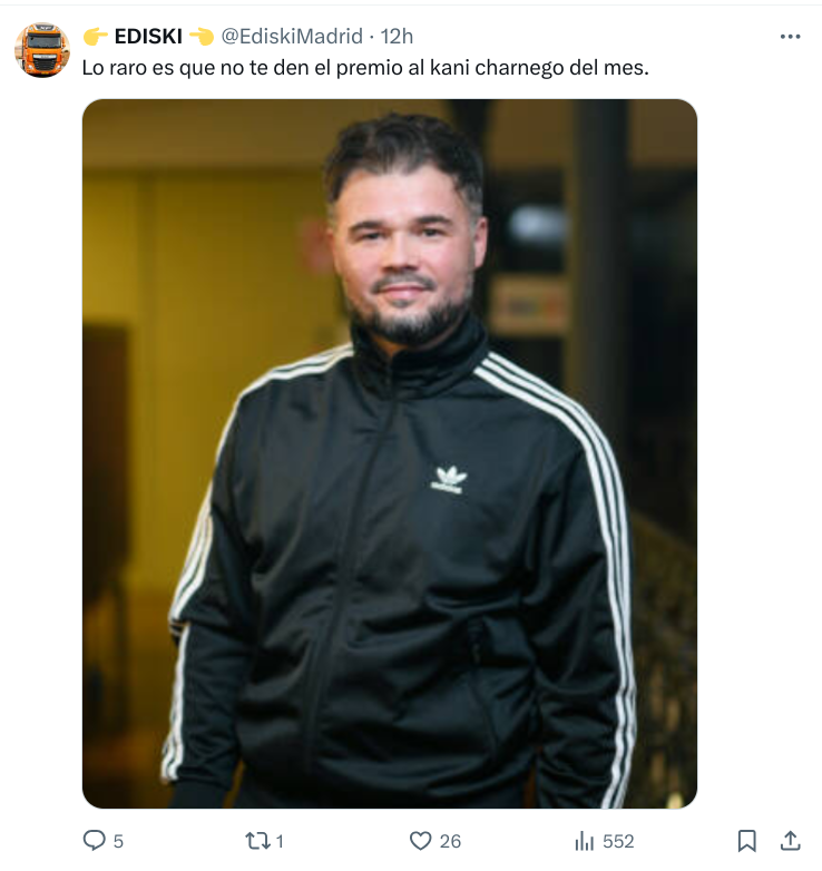 El portavoz de ERC en Madrid publicó, gozoso, una foto con el galardón que le han otorgado. Lo que viene a ser una clara demostración de la persecución que sufren los separatistas cuando acuden a la capital de España. En el post que ha compartido Rufián en su cuenta de X se pueden leer cantidad de mofas dirigidas a su persona, y es que el secesionista es la risa constante en las redes sociales.