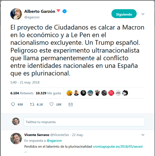 Y a mí me parece que en esa frase nos traslada todos los “errores/males” que sufre la izquierda española: ¡No se enteran! O no quieren enterarse. Y no tanto por su tendenciosa definición de lo que es Ciudadanos; conste que en parte tiene razón, el programa de Macron y el de Rivera se parecen, pero, en todo, caso sería Macron quien copio, calcó, a C’s, mas que nada por una cuestión cronológica.