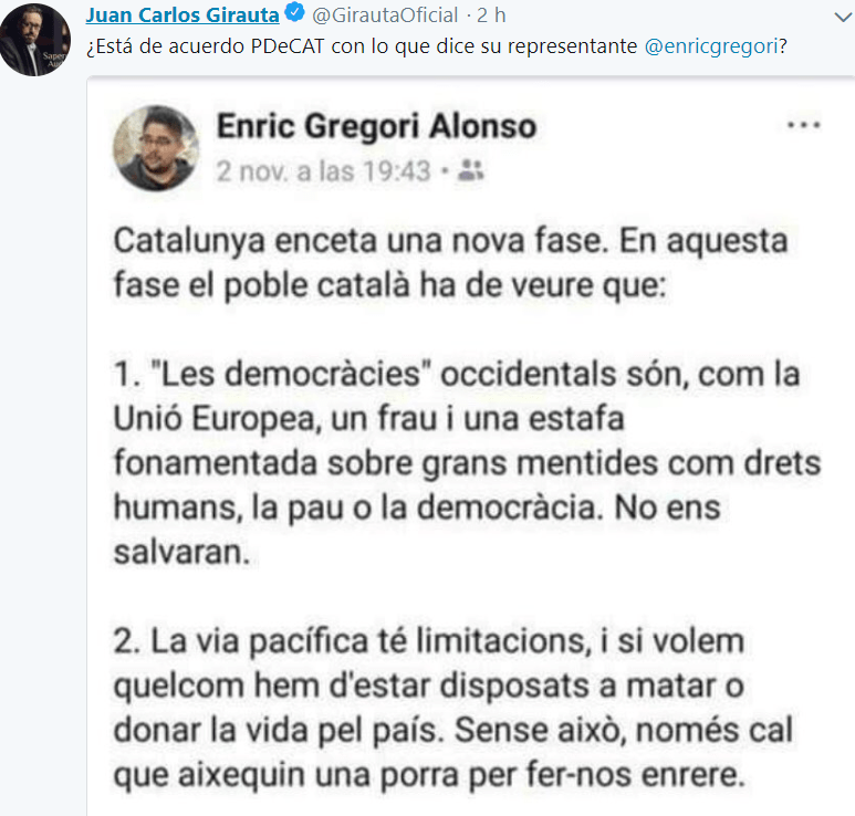 Girauta ha colgado una imagen de un mensaje en redes sociales de Enric Gregori fechado el 2 de noviembre en el que asegura que «Cataluña inicia una nueva fase. En esta fase el pueblo catalán ha de ver que».