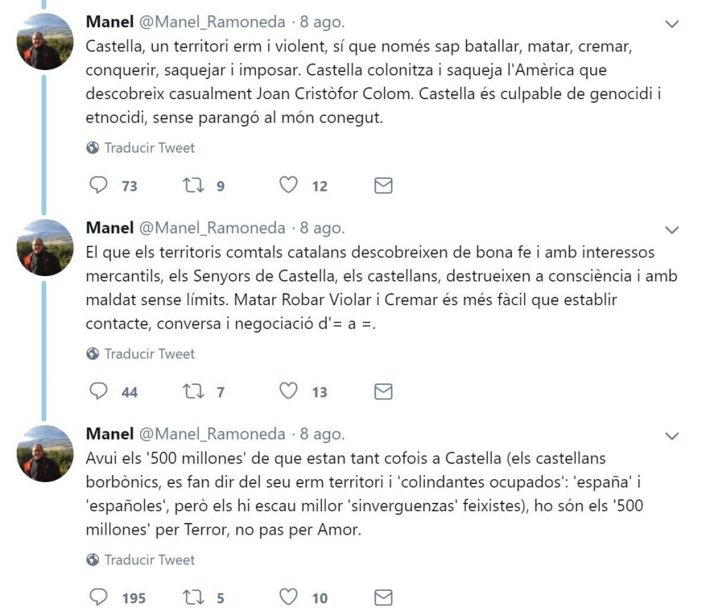 Y añade que «Castilla» es un «territorio yermo y violento» que «sí que solo sabe batallar, matar, quemar, conquistar, saquear e imponer. Castilla coloniza y saquea la América que casualmente descubre Joan Cristòfor Colom».