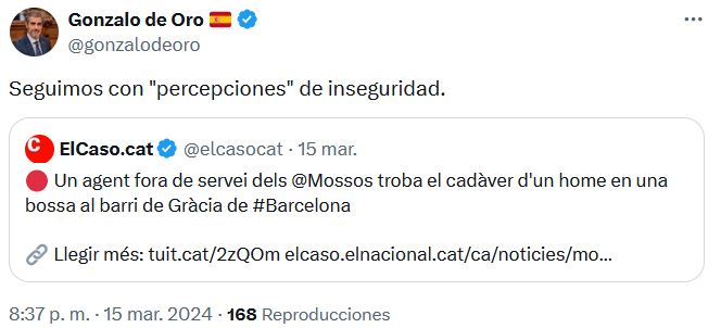 Gonzalo de Oro, presidente del grupo municipal de VOX en el Ayuntamiento de Barcelona denunció la inseguridad que vive Barcelona, criticando como el equipo de gobierno de Collboni intenta minimizar lo que es una grave crisis en la capital catalana. No en vano la falta de seguridad es una de las principales preocupaciones de los barceloneses.