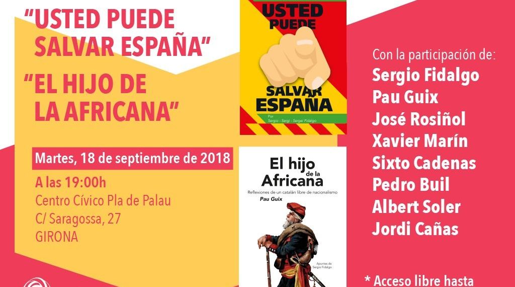 Pau Guix presentará su último libro, ‘El hijo de la africana’ y Sergio Fidalgo ‘Usted puede salvar España’ en Girona, ambos de Ediciones Hildy, arropados por el presidente de Societat Civil Catalana, José Rosiñol.