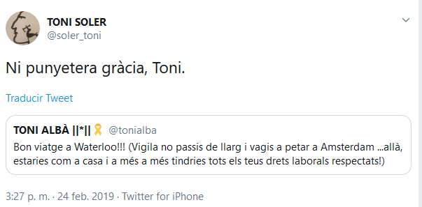 Dicho mensaje de Toni Albà ha encontrado contestación hasta de parte de Toni Soler, que le ha puesto un mensaje en Twitter con un simple pero contundente, «ni puñetera gracia, Toni«, le ha espetado Soler.