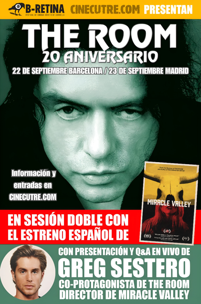 Dos únicas sesiones organizadas en conjunto por los festivales B-Retina y CutreCon, a las que además acudirá el actor estadounidense Greg Sestero, coprotagonista de la película y autor del exitoso libro “The Disaster Artist”. Dicho libro cuenta la génesis de “The Room” y fue adaptado al cine por James Franco, en un filme que ganó la Concha de Oro del Festival de San Sebastián en 2017.