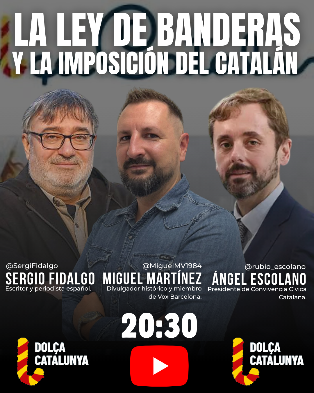 Hoy a las 20:30 ‘L’hora dolça’ estará dedicado a «La ley de banderas y la imposición del catalán», con Miguel Martínez (divulgador histórico y miembro de VOX Barcelona), Ángel Escolano (presidente de Convivencia Cívica Catalana) y Sergio Fidalgo (director de elCatalán.es). Se podrá ver en el canal de YouTube de Dolça Catalunya.