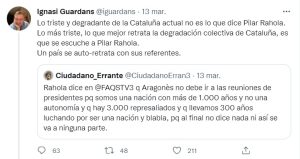 «Lo triste y degradante de la Cataluña actual no es lo que dice Pilar Rahola. Lo más triste, lo que mejor retrata la degradación colectiva de Cataluña, es que se escuche a Pilar Rahola. Un país se auto-retrata con sus referentes» afirmó Guardans en su cuenta de Twitter.