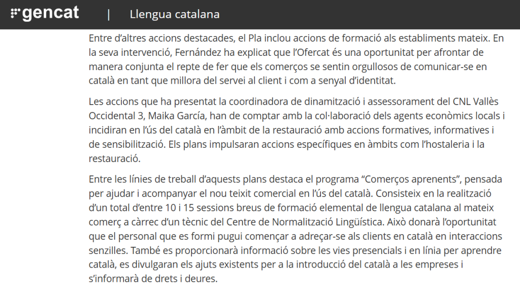 Este plan ya se está desarrollando en algunas localidades cercanas a Barcelona, como Sant Cugat del Vallés y Cerdanyola del Vallés y una de sus acciones es ‘Comerços aprenents’ que consiste en enviar a los comercios, para que los dependientes no tengan escapatoria y no puedan decidir si van o no a escuelas de formación, a comisarios lingüísticos (‘técnicos del Centro de Normalización Lingüística’ en el lenguaje de la administración) para darles clases de formación elemental de lengua catalana.