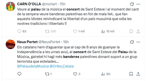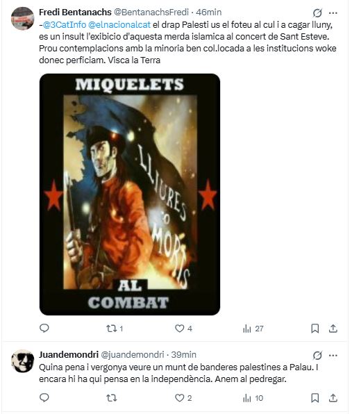 Otros separatistas han dicho que es «una pena y una vergüenza ver un montón de banderas palestinas al Palau. Y todavía hay quién piensa en la independencia. Vamos al desastre» y que «los catalanes hemos de aguantar que ocho años después de ganar la independencia en las urnas, casi haya más banderas palestinas dando apoyo a un grupo terrorista que esteladas».