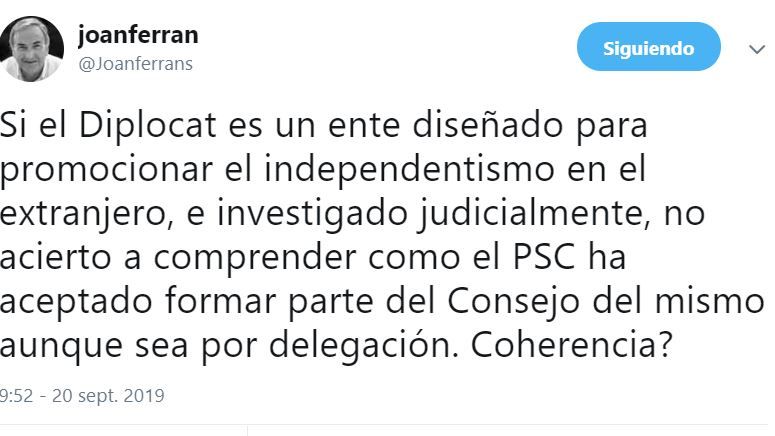 De ahí que merezca nuestro aplauso que alguien como él, con una larga trayectoria en el PSC en el puente de mando de esta formación, ponga en cuestión la decisión del grupo municipal socialista en el Ayuntamiento de Barcelona de haber aceptado que la regidora Laia Bonet forme parte del pleno del Diplocat.