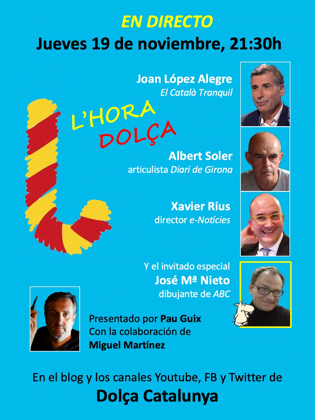 Moderarán Pau Guix y Miguel Martínez, y el invitado sorpresa será José María Nieto, humorista gráfico de ABC. Se podrá seguir desde los canales de Youtube y Facebook de Dolça Catalunya y desde su perfil de Twitter (@DolcaCatalunya).