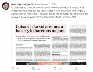 «El que cuando vuelvan a convocar un referéndum ilegal y a declarar la independencia diga que los separatistas le han engañado será simple y llanamente un mentiroso. Todos los tratos con el independentismo no son más que gasolina para volver a incendiarlo todo (literalmente)«, ha sentenciado con certera claridad y acierto Joan López Alegre.