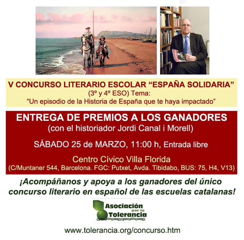 La Asociación por la Tolerancia entregará el próximo sábado 25 de marzo a las 11:00 los premios de su Vº Concurso Literario «España Solidaria» para alumnos de 3º y 4º de ESO. El tema es «un episodio de la Historia de España que te haya impactado».