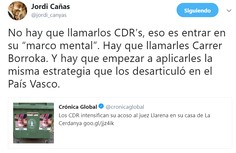 Cañas asegura que llamarles «CDR» es entrar en «su marco mental», porque significa reconocerles como «defensores de una República», cuando en realidad son radicales que atentan contra la convivencia y contra los derechos y libertades de centenares de miles de catalanes.