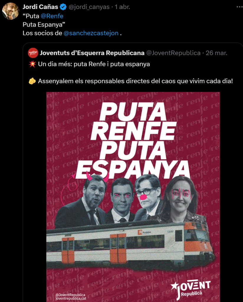 Las juventudes de Esquerra Republicana han decidido insultar a España aprovechando el mal servicio de Rodalies, los trenes de cercanías en Cataluña. A pesar de que la gestión de Rodalies está en manos de la Generalitat desde hace años, y que Esquerra ha formado parte del gobierno autonómico desde 2015 hasta 2024, Jovent Republicà – que es la marca de los ‘cachorros’ de ERC – ha creado una campaña altamente ofensiva.