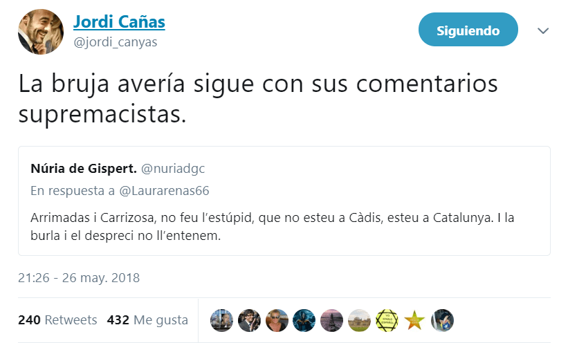 Cañas, con brevedad pero con contundencia ha contestado a Núria de Gispert en esa misma red social y ha asegurado que «la bruja avería sigue con sus comentarios supremacistas».