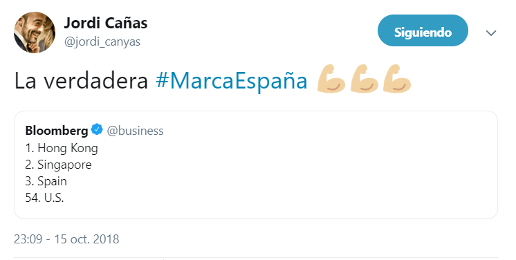 Esta información lleva a Cañas a decir que esta es la «verdadera marca España» y adjunta diversos emoticonos que enfatizan su alegría por la buena valoración del sistema sanitario español.