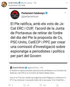 Rufián se escandalizaba en sus redes sociales sobre las explicaciones que ha dado sobre el asunto el Ejecutivo de Pedro Sánchez afirmando que «el Gobierno había prometido explicaciones de Robles en la Comisión de Defensa y del CNI en la Comisión de Gastos Reservados. Hoy en la 1ª se han vetado las preguntas sobre Pegasus y mañana en la 2ª ni hay cámaras ni se puede hablar de lo que pase. O te inhabilitan. Acojonante«, afirmaba el portavoz de Esquerra en la cámara baja.