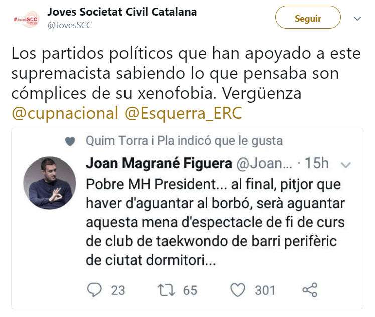 Joves de Societat Catalana ha denunciado en su cuenta de la red social twitter el «supremacismo» y la «xenofobia» de Quim Torra y ha llamado a ERC y la CUP sus «cómplices».