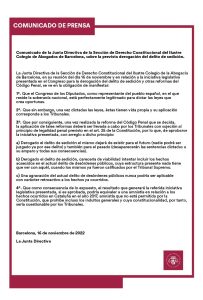 Ante este hecho, un grupo de juristas del Colegio de Abogados de Barcelona ha emitido un comunicado donde cuestionan la constitucionalidad de dicha reforma del Código Penal. En dicho posicionamiento desgranan las siguientes consecuencias: