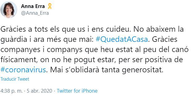 Esta política de JxCAT ha hecho público un mensaje en el que «da las gracias a todos los que nos cuidáis».