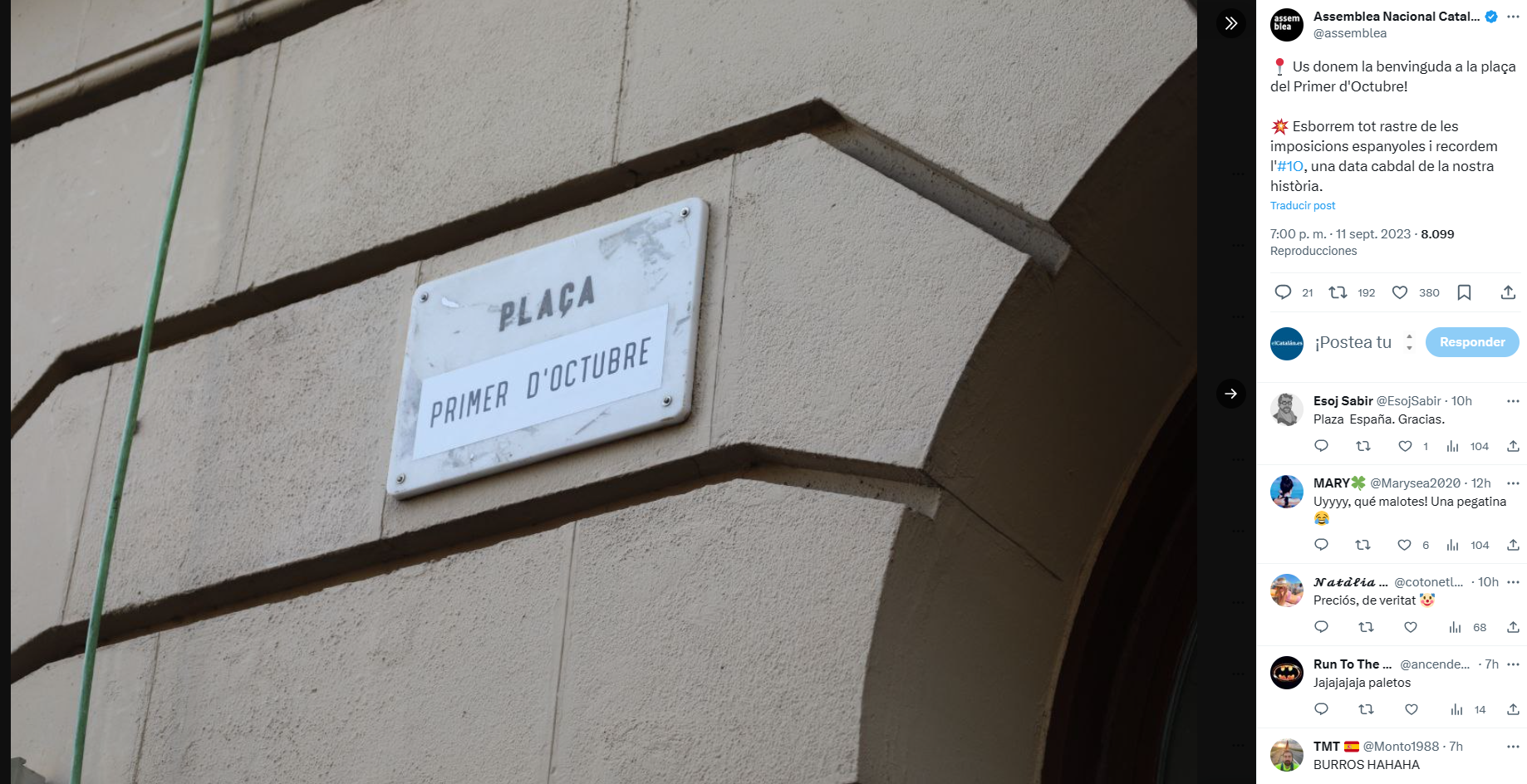El final de la manifestación secesionista fue en la plaza España de Barcelona, y se produjo un hecho lamentable del cual la ANC ha sacado pecho y es que ‘borraron’ el nombre de la plaza para colocar en su lugar el de 1 de octubre. Fecha de la consulta ilegal que el independentismo celebró en Cataluña en el 2017. Una vez más, queda acreditado que el independentismo vive instalado en la impunidad y que consideran que todos los lugares públicos les pertenecen únicamente a ellos y su ideología sectaria y trasnochada.