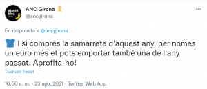 Desde varios perfiles de la entidad independentista, como si fueran un outlet, han comenzado las rebajas y regalan material por la compra de otro. La cosa pinta muy mal, y hay que sacar dinero de donde sea para seguir promocionando la independencia.