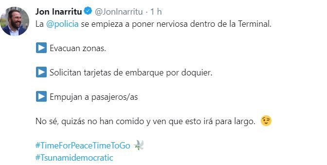 «Nada más llegar al Aeropuerto de Barcelona @JonInarritu se ha encontrado con la primera movilización de #TsunamiDemocratic para denunciar la sentencia contra los líderes independentistas catalanes».