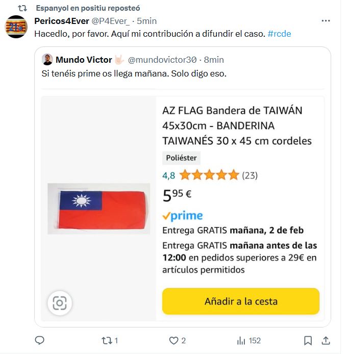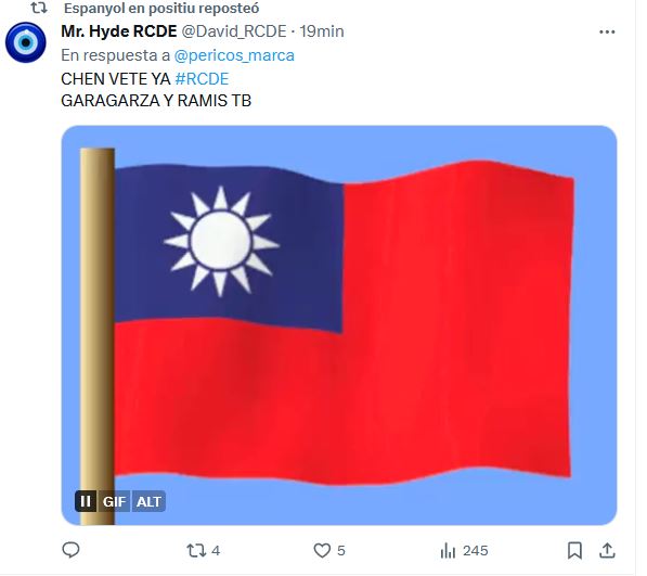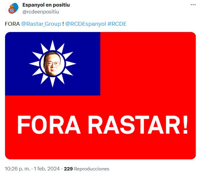 El colectivo ‘Espanyol en positiu’, activo en redes sociales, ha ido más allá y ha difundido un meme en su perfil de la red social X en el que se ve la cara del presidente Chen Yansheng dentro de una bandera de Taiwán, con el lema «Fuera Rastar».