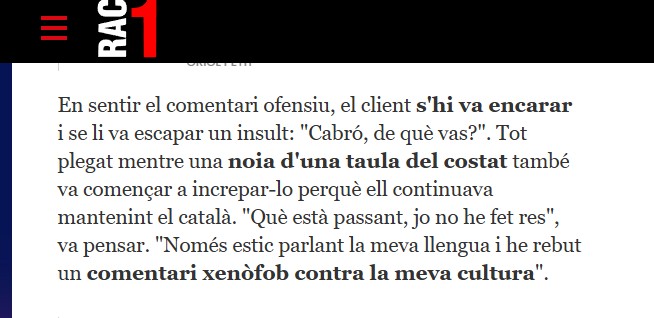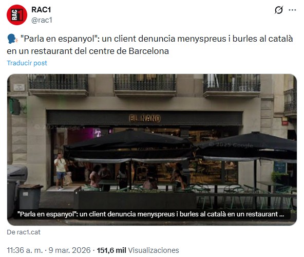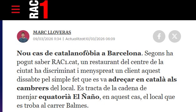 La radio del grupo editor de ‘La Vanguardia’ ha emprendido una campaña de acoso por razones lingüísticas contra un restaurante de Barcelona basado en el testimonio de un cliente que denuncia «catalanofobia«, y ha provocado un linchamiento en redes de dicho local. RAC1 ha dado un gran protagonismo a un presunto incidente en el restaurante ecuatoriano ‘El ñaño’, en el que un individuo asegura que tras hablar en catalán con una camarera otro camarero le dijo «habla en español».