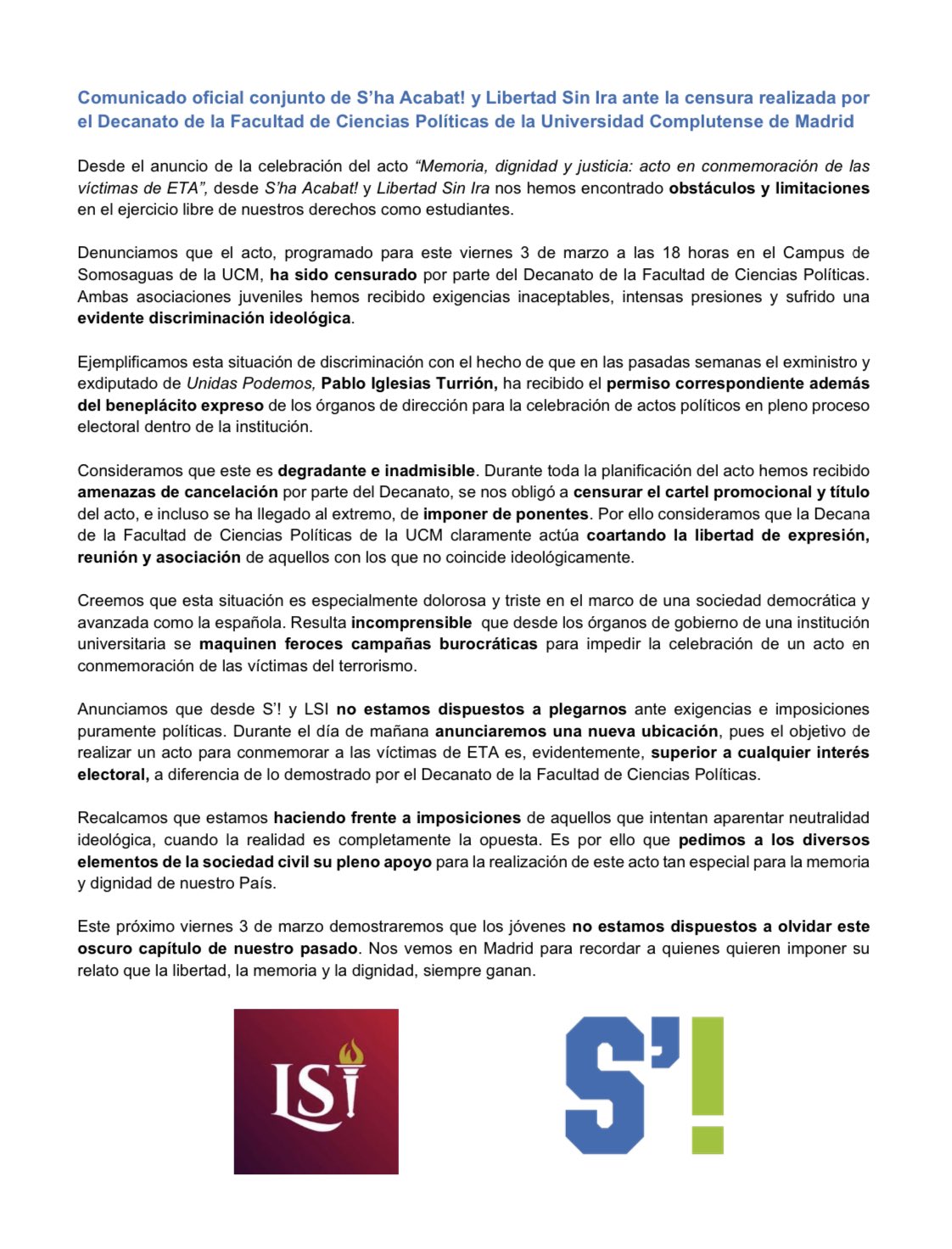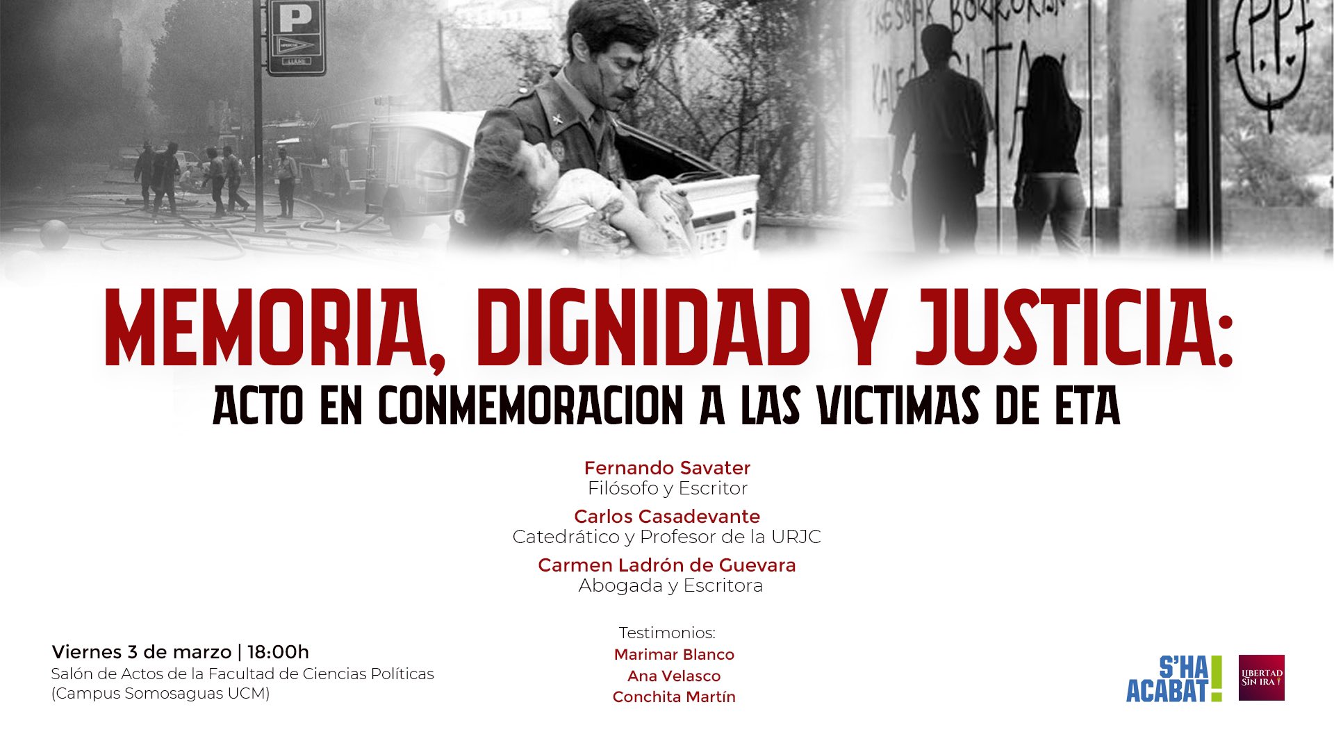 La facultad de Ciencias Políticas de la Universidad Complutense de Madrid ha censurado el acto en homenaje a las víctimas de ETA organizado por las asociaciones S’HA ACABAT! y Libertad sin Ira este viernes 3 de marzo, un hecho que han denunciado ambas entidades en un comunicado.