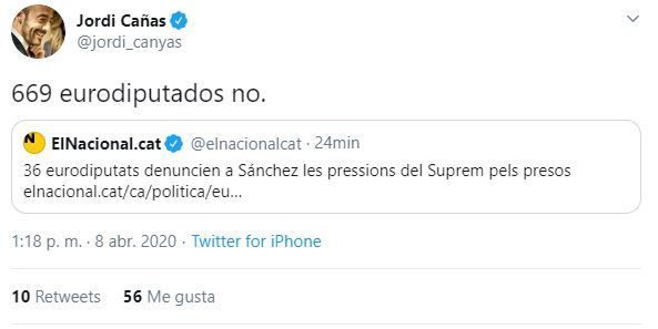 Cañas ha recordado a ElNacional.cat que si bien es cierto que 36 eurodiputados ha mandado dicha misiva a Pedro Sánchez, hay 669 parlamentarios que no han secundado esta iniciativa, por lo que es el sentir de una minoría muy minoritaria de la cámara.