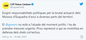 Dolors Sabater, candidata de la CUP en las elecciones catalanas, ha señalado que «cuando el papel de la policía aporta más peligro que seguridad, el modelo es inservible. La militarización policial crea más problemas, más riesgos, más heridas. El modelo represivo tiene que acabar», ha sentenciado Sabater.