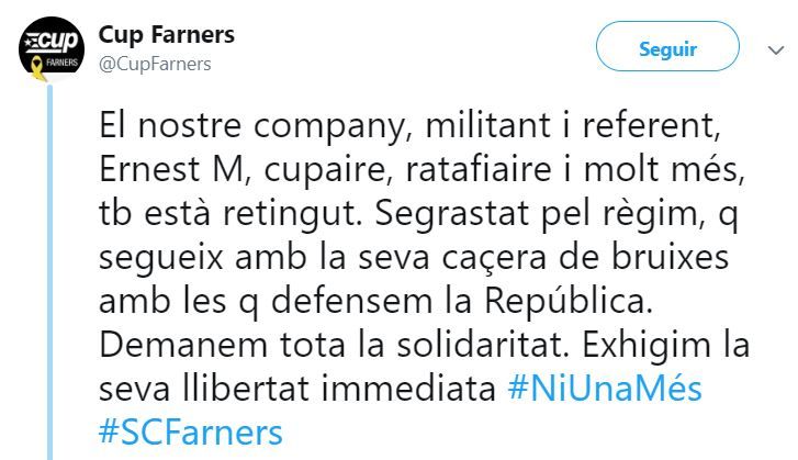 La CUP de la localidad gerundense de Santa Coloma de Farners hizo público un tuit en el que protestaba por el arresto del sobrino de Quim Torra.