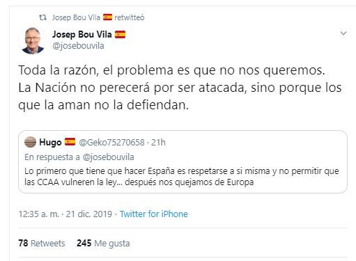 Bou dijo que «creo que la U.E. ni quiere, ni respeta a ESPAÑA. Que es lo mismo que no querer ni respetar a sus miembros que son Estados Naciones. Quo Vadis Europa».