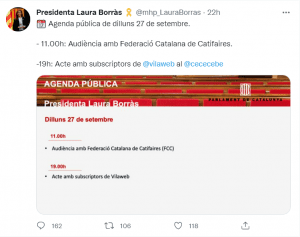 Según ha publicado ella misma en sus redes sociales, a las 11:00 horas ha tenido una reunión con la Federació Catalana de Catifaires y a las 19:00 horas un acto con suscriptores del digital separatista Vilaweb. Una ‘estresante’ agenda de la imputada presidenta del Parlament. Sin lugar a dudas. Cabe recordar que Laura Borràs se embolsa 155.570 euros anuales.
