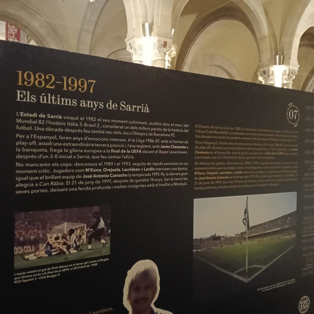 Lo mismo pasa con la carencia de una hemeroteca y biblioteca perica. O de cualquier otra cosa que se puedan imaginar. La exposición que se dedicó hace un par de años al centenario de Sarriá fue otra actividad para salir del paso, en un lugar alejado del centro y que parecía más un trámite que otra cosa. Y, por supuesto, la exposición del 125º aniversario ha vuelto a pecar del mismo defecto: una muestra que solo se ha podido visitar durante cinco días y que ha consistido en unos cuantos paneles con fotografías casi todas ellas muy conocidas, con textos muy cortos que apenas superan la divulgación que puede dar un diario generalista y sin ningún tipo de soporte audiovisual.