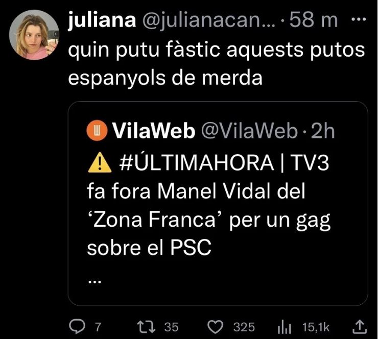 Cuando hace unos meses la dirección de TV3 despidió al humorista Manel Vidal por un gag en el programa ‘Zona Franca’ en el que vinculaba a los dirigentes y votantes socialistas con la esvástica nazi, Canet dijo en sus redes sociales «putos españoles de mierda» para mostrar su enfado con esta decisión de la cadena tras las presiones que ejercieron los socialistas catalanes.